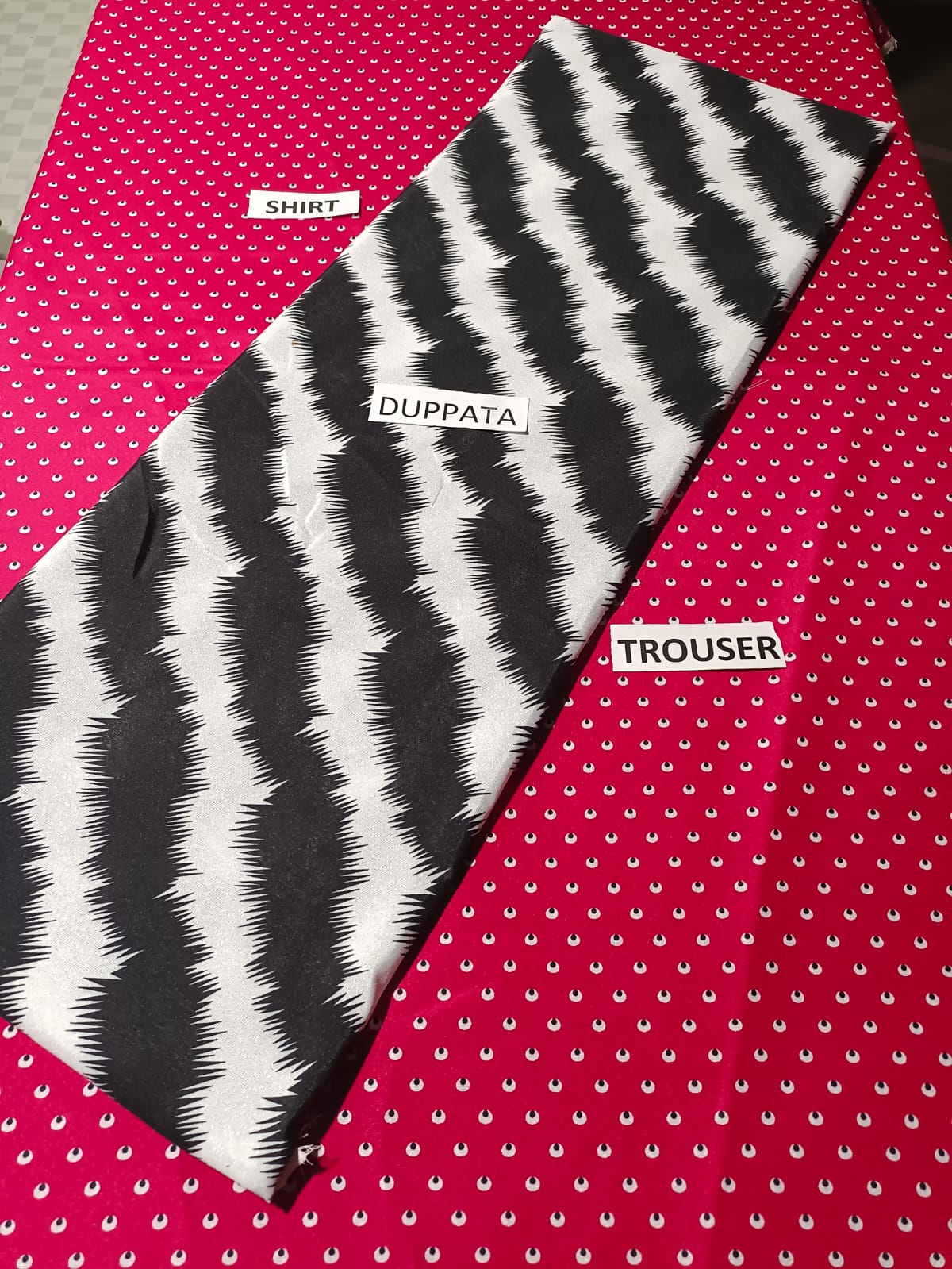 1 printed piece for shirt (front, back, sleeves, and trouser) 5 yards,