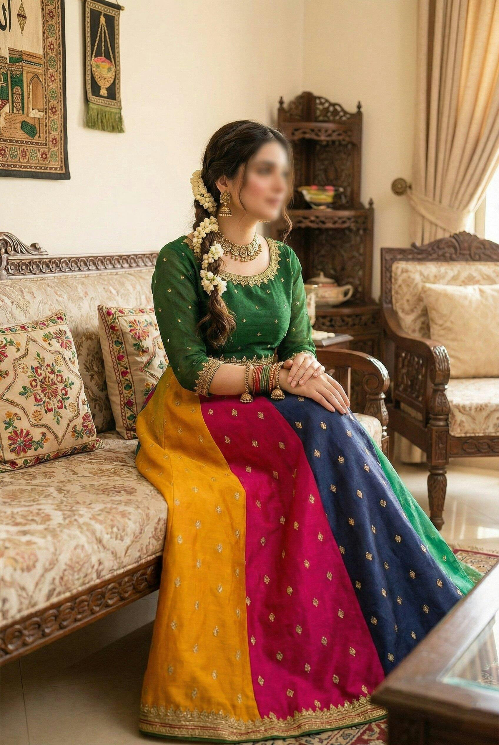 - 1 embroidered Piece for lehnga in Olive colour (26 inches)