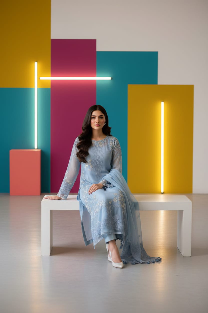 Embroidered 3pc Organza Dress with Organza Duppata - 150